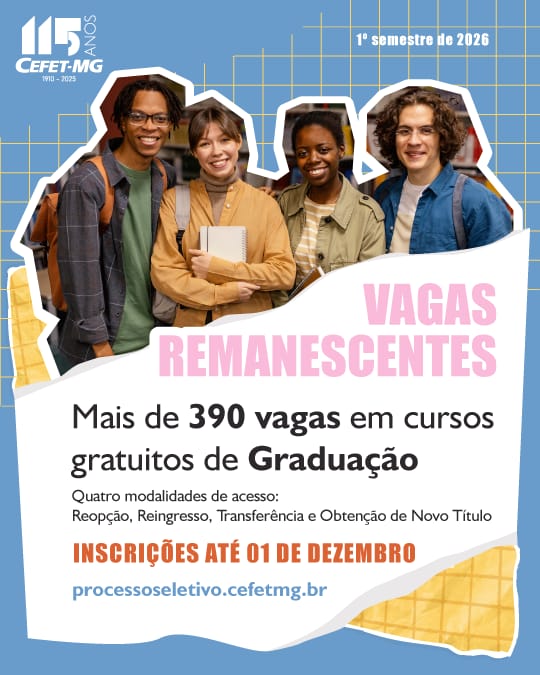 O CEFET-MG receberá inscrições, até 01 de dezembro, para o processo seletivo de vagas remanescentes da graduação. As vagas são ofertadas nas modalidades reopção de curso, reingresso, transferência e obtenção de novo título.